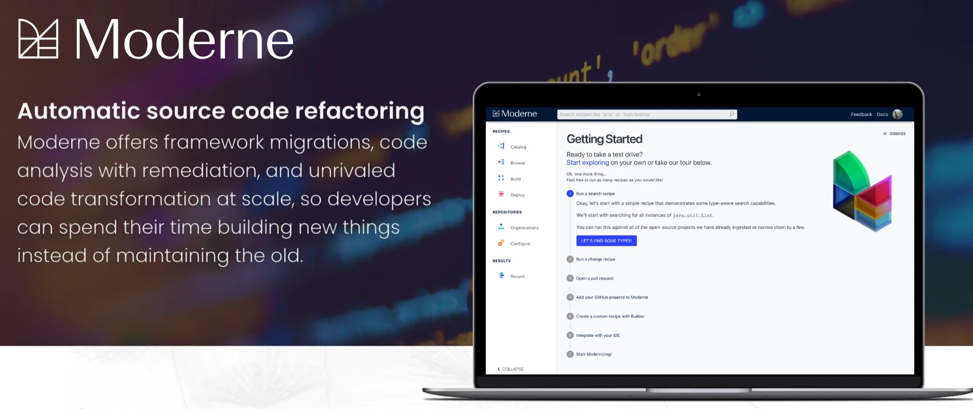 I was one of the 6 founding engineers tasked with building the first version of Moderne, a platform reinventing how to maintain, secure, and automatically refactor enterprise applications. I helped architect the frontend, infrastructure, developer tools, and advance prototypes. I also made significant contributions to every major feature and milestone.