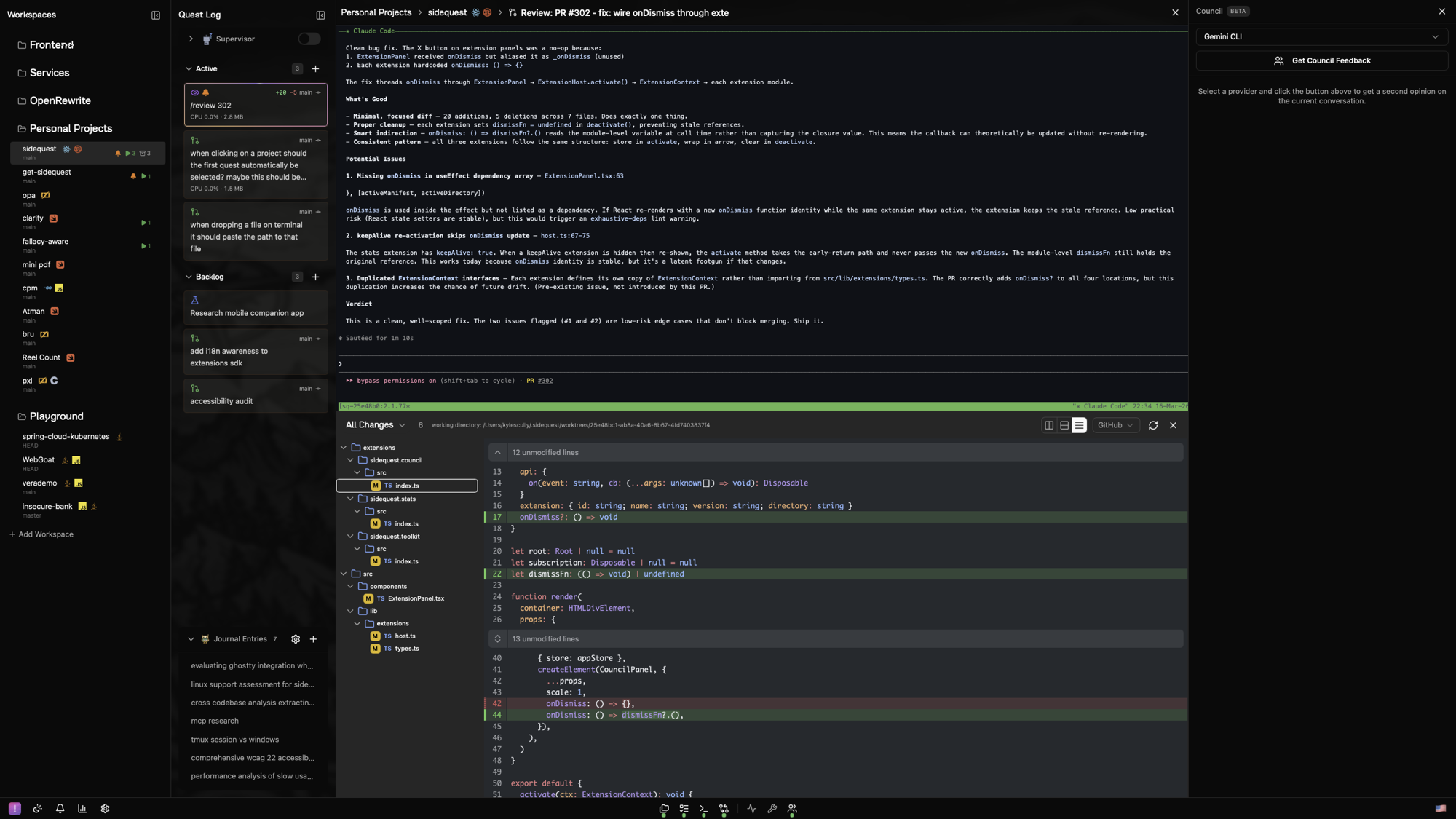 An IDE for orchestrating multiple AI agents in parallel. It started as a project called Kumi in June 2025 to satisfy my need for a Slack-like way to interface with multiple agents. I had built a supervisor command for Claude Code that spun up and managed multiple sessions in tmux, using expensive models for thinking and task breakdown while inexpensive models handled the grunt work. I started referring to my use of it as "side questing" and eventually renamed it. At its core it is still tailored mostly to me and how I use it, but I have tried to make design decisions that keep it flexible enough to accommodate a rapidly evolving AI landscape.